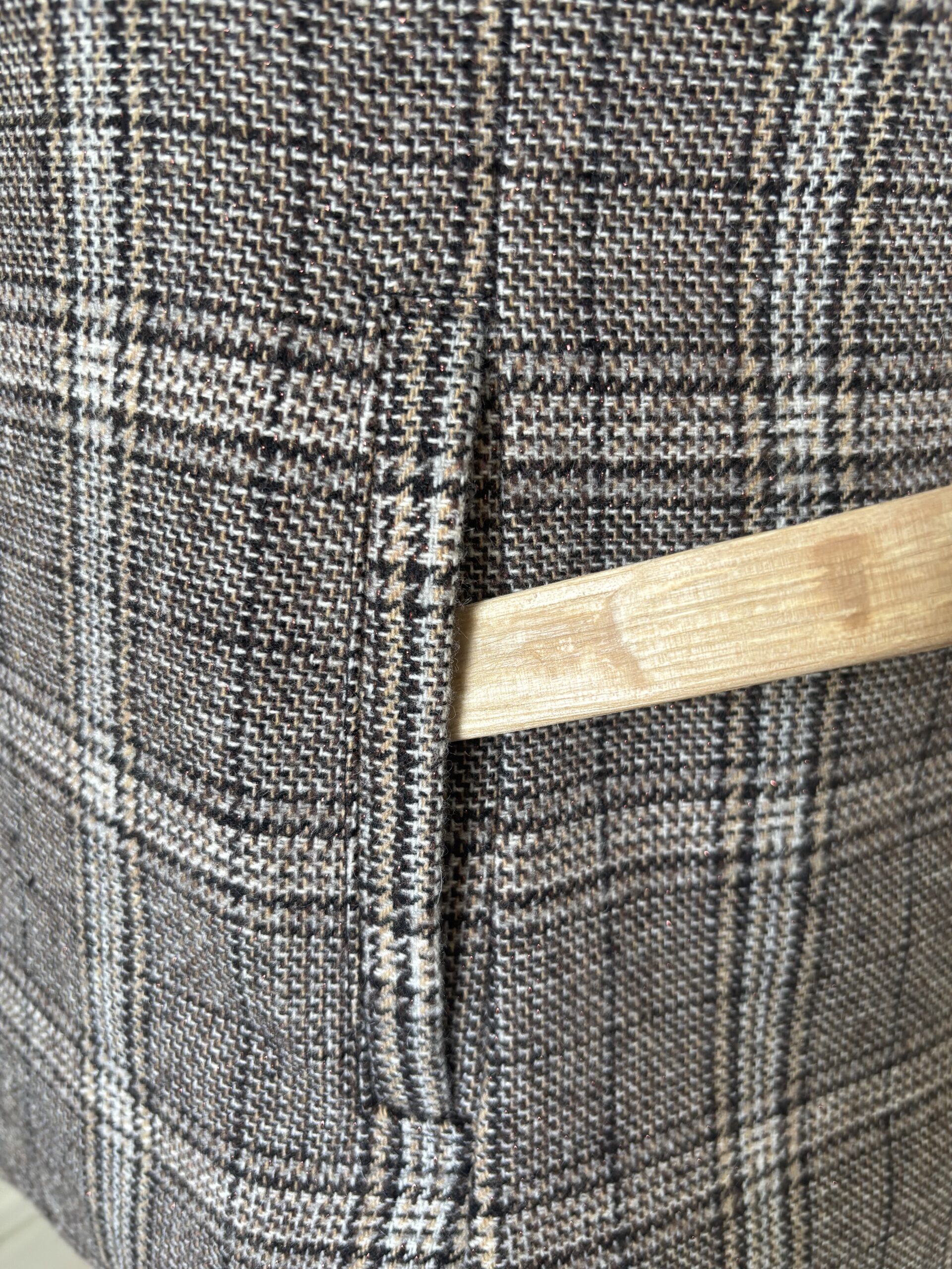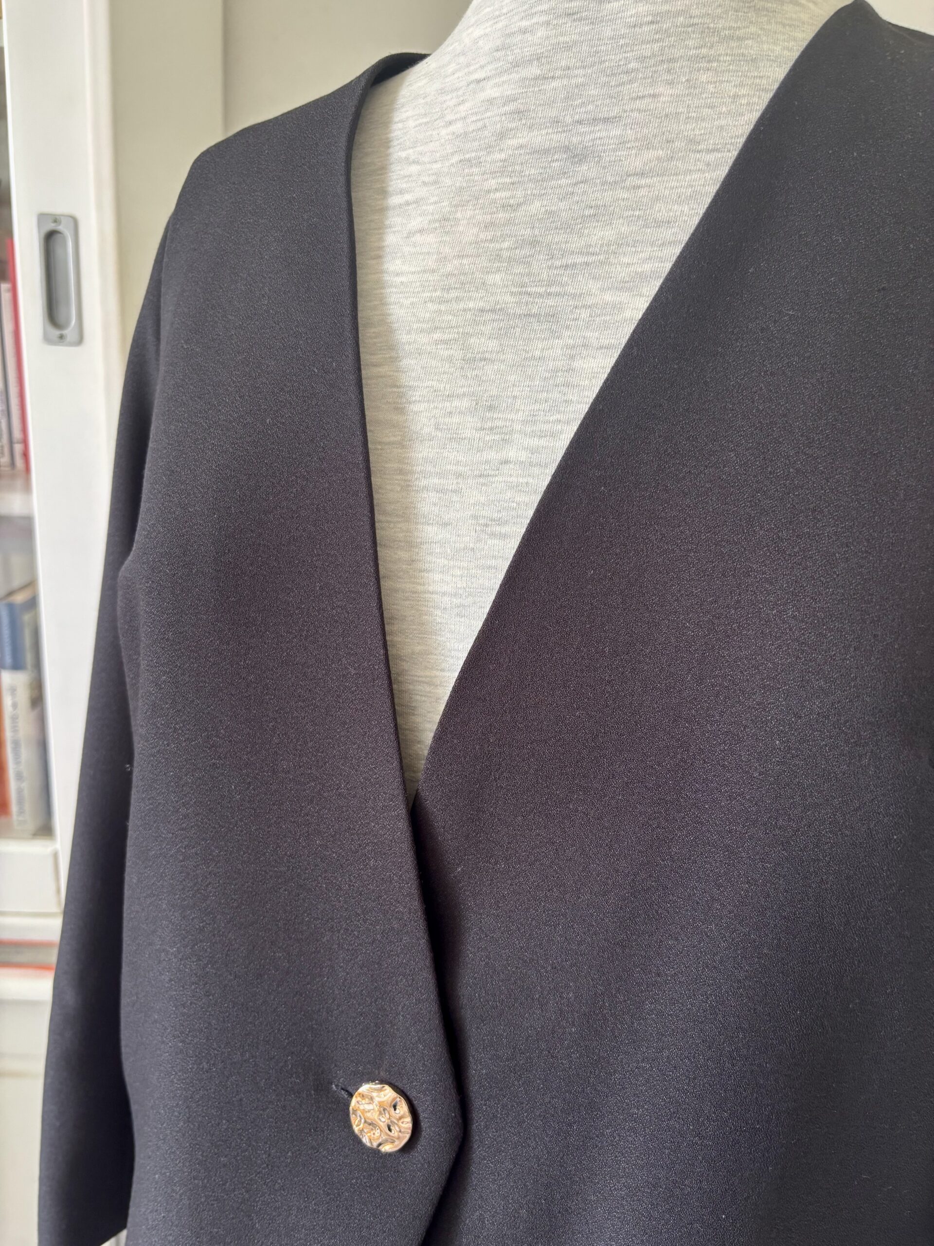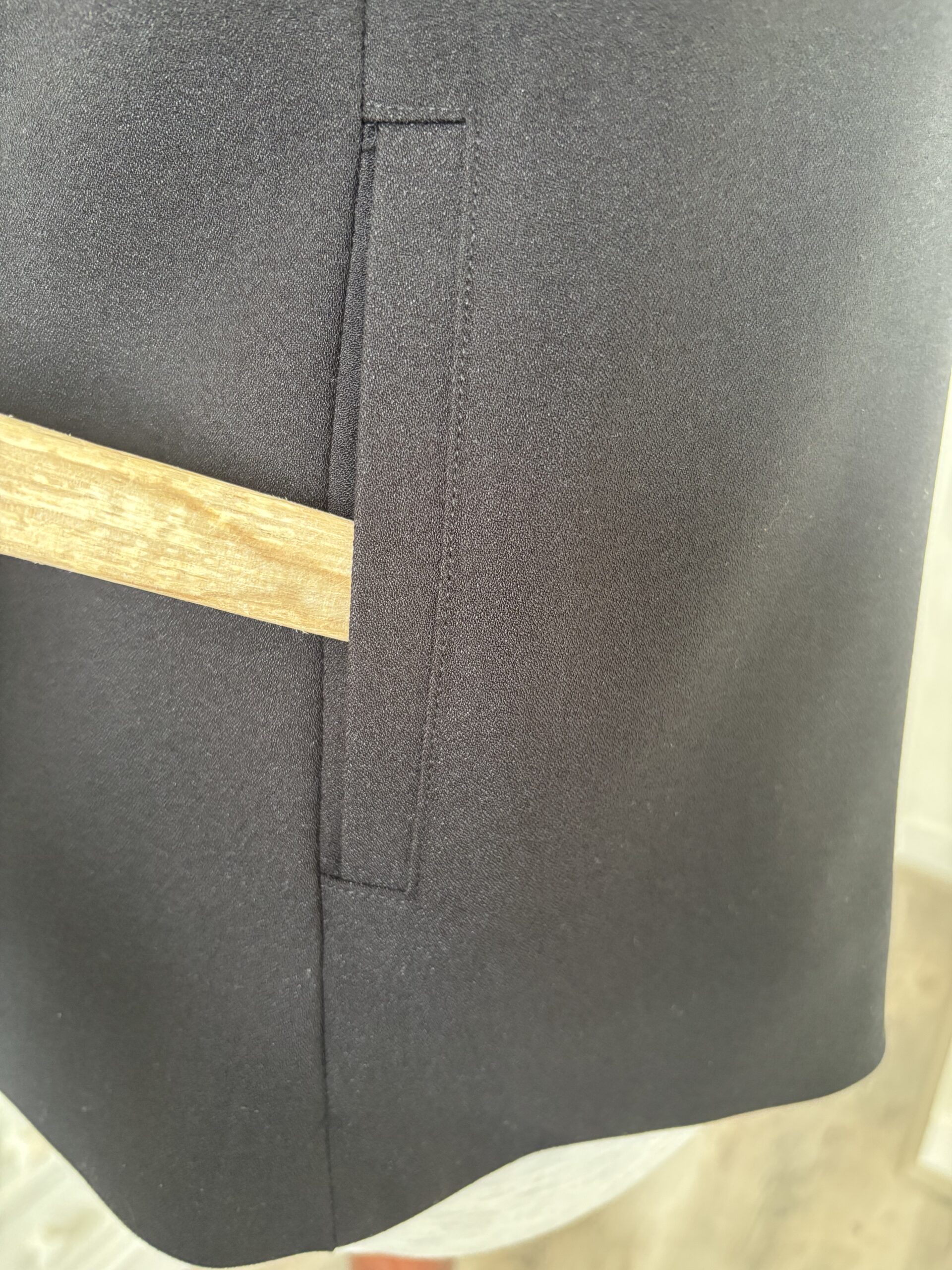 Sa coupe semi ajustée structure la silhouette, les poches, discrètes mais indispensables sont prises dans la couture du devant. Enfin, la base pourra, au choix, être oblique ou droite avec une base légèrement arrondie.